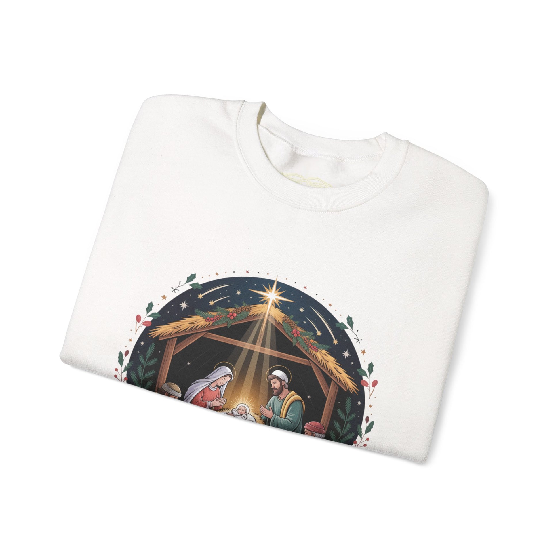 Wrap yourself in a quiet, reverent moment. This crewneck carries embroidered lines that celebrate the birth of Jesus Christ with understated dignity — a soft refuge or sitting by the tree with family. The medium-weight cotton-poly blend feels familiar and steady against the skin. It retains its shape through repeated wear, ensuring the message remains clear and the fit stays true. Wear it to chapel gatherings, nativity rehearsals, or when you want your faith to speak softly through your attire. The restrained embroidery placement lets the design feel like a personal statement rather than loud decoration, blending with everyday winter layers.