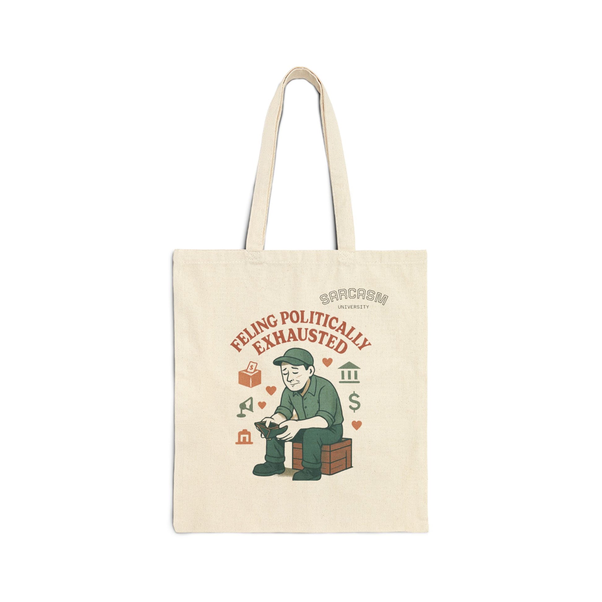 This cotton canvas tote bag exudes sarcasm and political exhaustion, perfect for the overworked and broke middle class. It is ideal for carrying everyday essentials and making a statement with its unique design. Relevant for those looking to add a touch of humor to their busy lives, especially during political events and social gatherings.